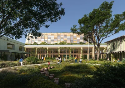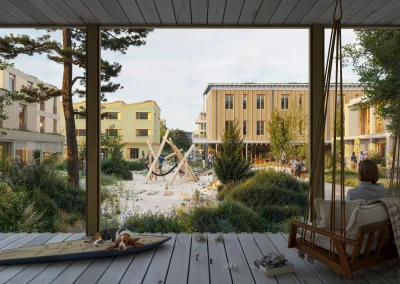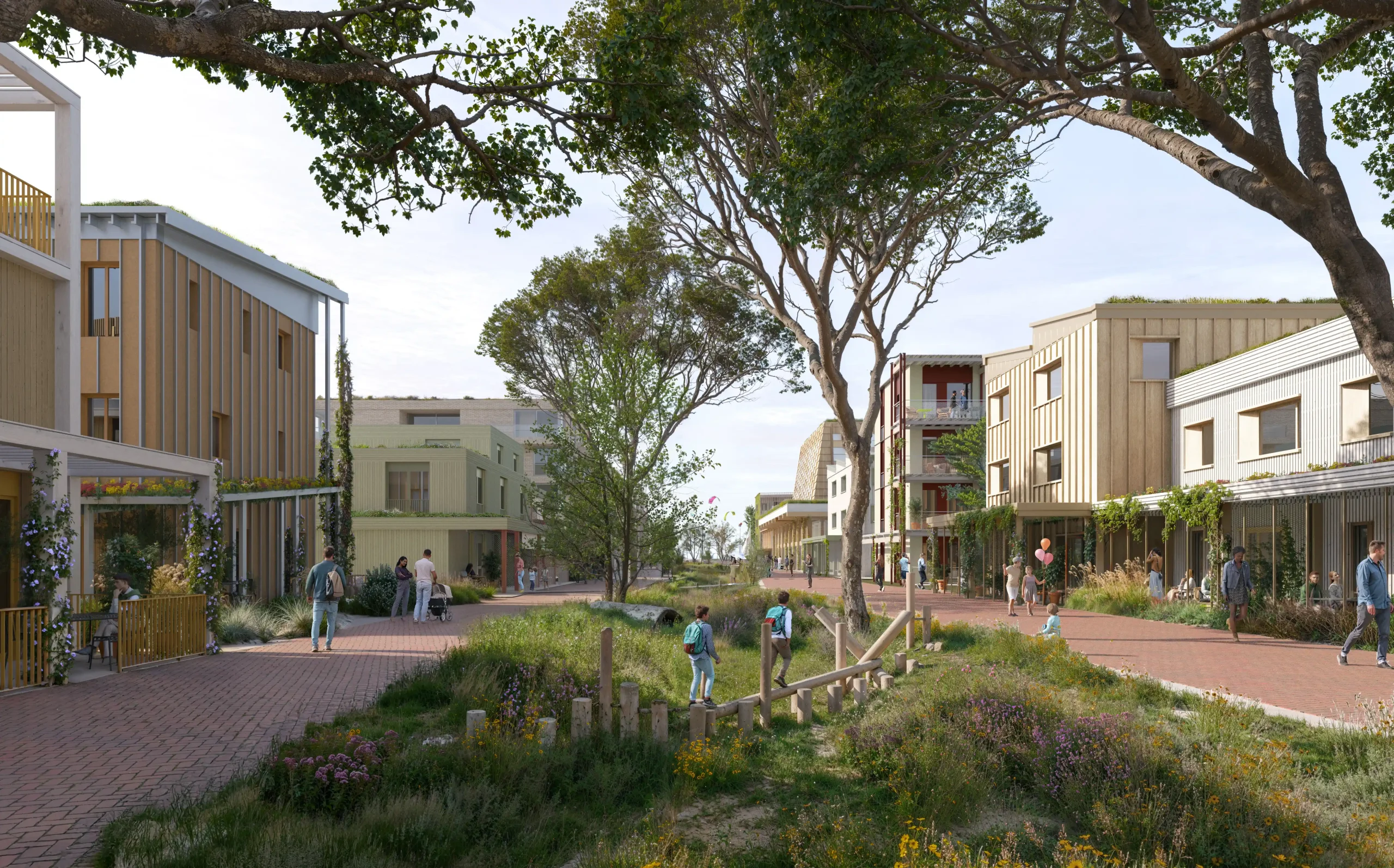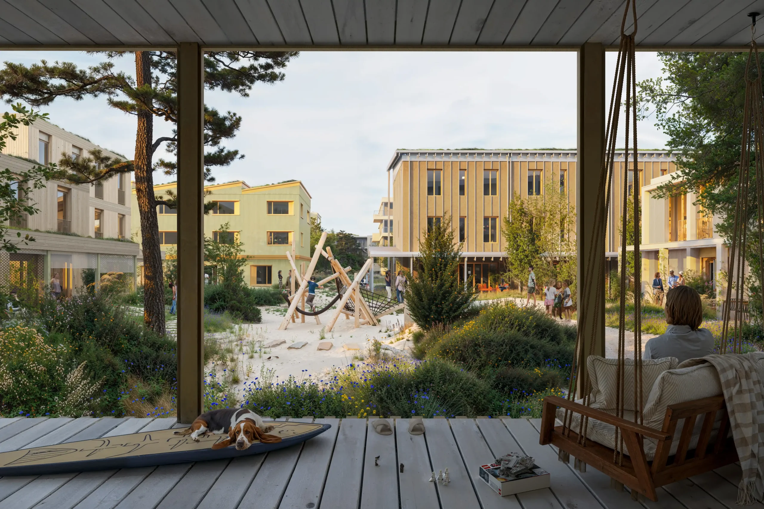De wijk verrijst in een robuust duinlandschap met hoogteverschillen die zorgen voor een rijke variatie aan flora en fauna. De gebouwen staan als losse paviljoens in het groen, omringd door veranda’s, terrassen en collectieve tuinen. Zo vervaagt de grens tussen binnen en buiten en wordt het landschap echt onderdeel van het wonen.